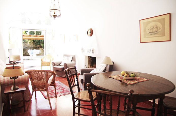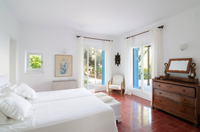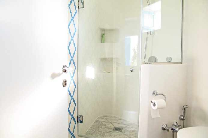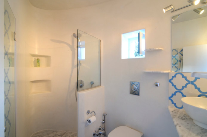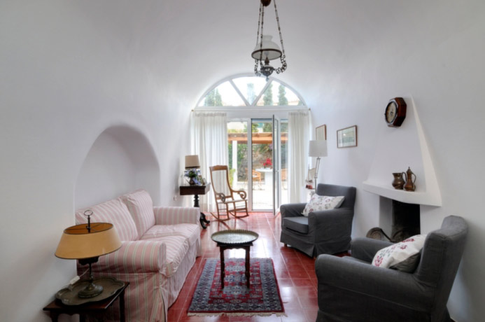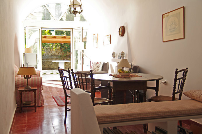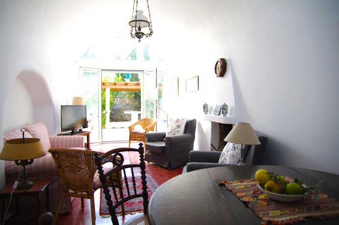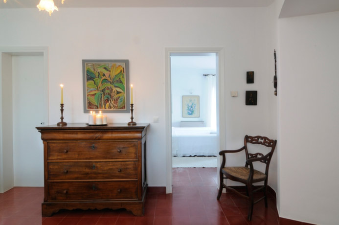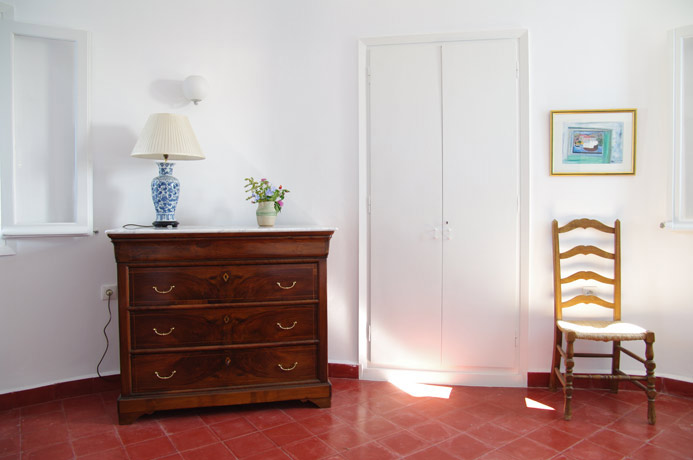 Going back down to the ground floor level, next to the kitchen is a lovely living room with comfortable furnishings and beautifully chosen antique objets d’art. The living room has French windows leading out to the garden. At the far end of the living room are a few steps which lead down to the third bedroom which has twin beds and direct access to the garden. This bedroom has a bathroom of antique marble chosen for its looks and its non-slip surface.